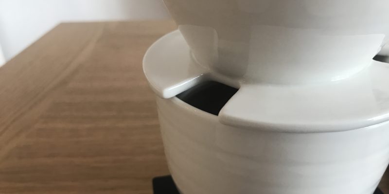 Si le résultat en tasse est le point essentiel avant tout achat, nous apprécions également le April Pour Over Brewer pour son côté “rituel”. Comme le mentionnait Patrik dans son interview, la préparation matinale d’un café peut suivre un rituel que l’on associe plus généralement au thé. De fait, le brewer vient en kit complet : le porte filtre, la tasse, le couvercle, et la soucoupe – le tout en céramique blanche ; ce qui explique d’ailleurs le prix un peu plus élevé que les autres solutions d’extraction manuelle. Complété par un filtre Kalita, vous n’aurez donc aucun élément extérieur à y ajouter, l’ensemble des accessoires se suffisant a eux-mêmes. La céramique gardant la chaleur très longtemps (chaleur que vous pouvez conserver encore plus longtemps avec le couvercle), il faudra patienter avant même de pouvoir tenir la tasse. Ce qui sera récompensé par un café encore plus agréable, la qualité de l’extraction se révélant davantage à moindre température.